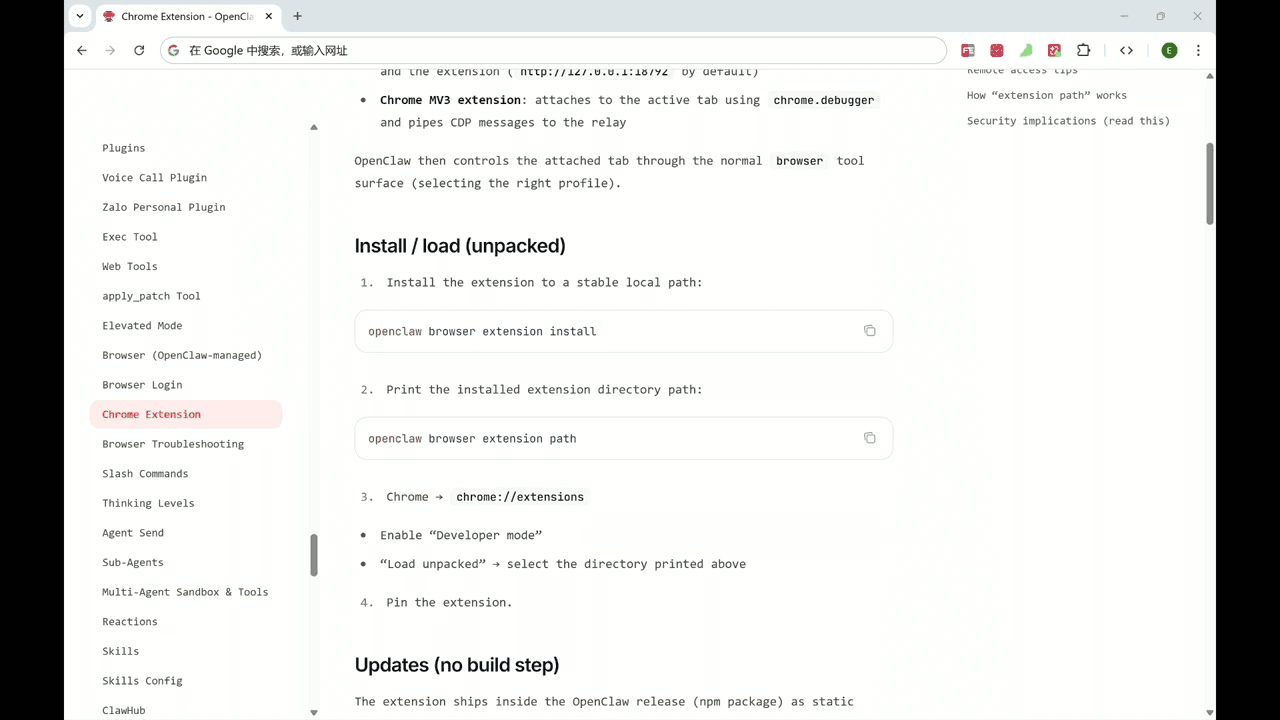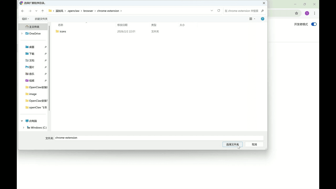 为了方便使用,点击浏览器工具栏上的拼图图标,找到 OpenClaw 插件,点击图钉图标将其固定: